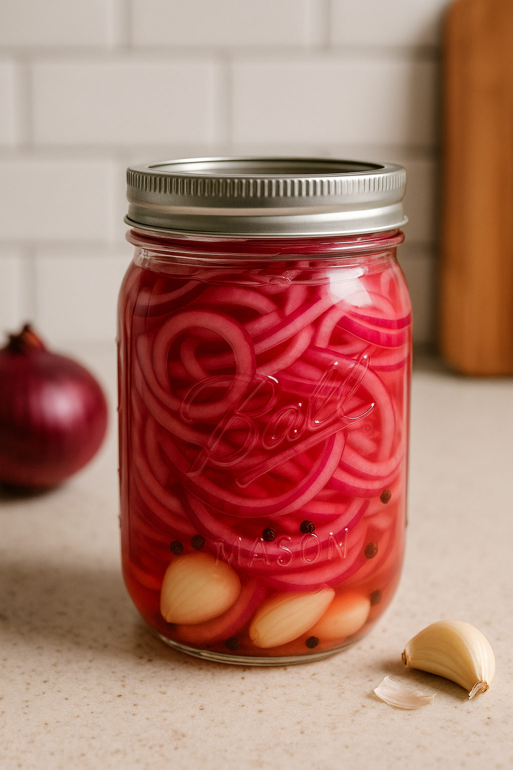 Thinly slice the red onion and peel the garlic. Add both to a large mason jar.
